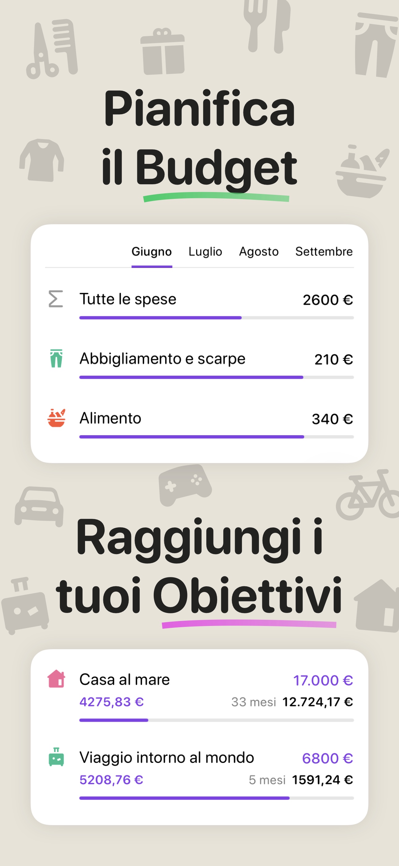 • Account e categorie personalizzabili—è possibile selezionare icone e colori.